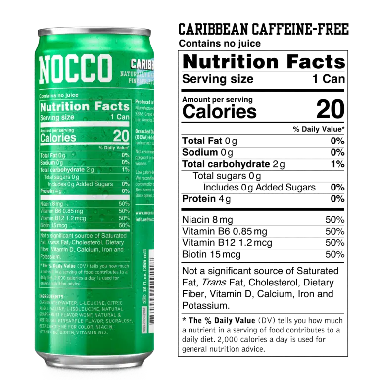 Imagine white, sand-swept beaches and crystal-clear blue waters! NOCCO BCAA+ Caribbean Caffeine-free has a sweet and refreshing taste of pineapple. Caribbean Caffeine-free include additional BCAAs.